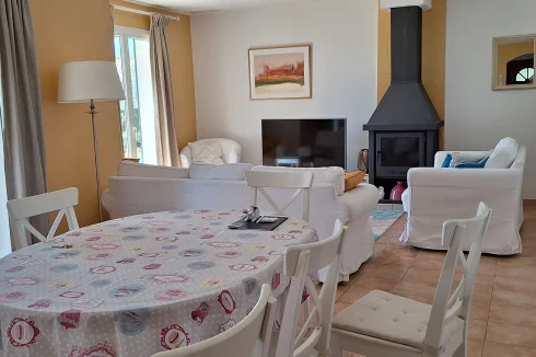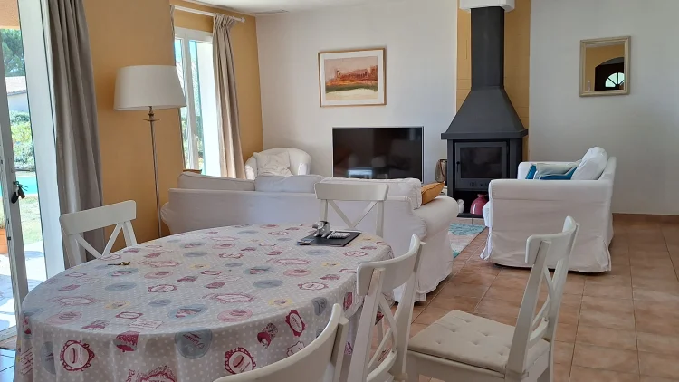 - 1 large living area: 1 fully equipped kitchen, 1 dining room, 1 lounge with wood-burning stove and TV.