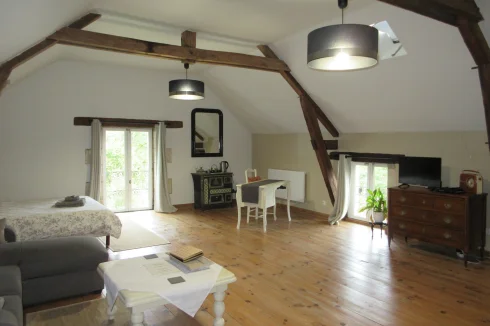 The guest house welcomes you into a living room with an open kitchen equiped with a wood burner and a loo on the ground floor Upstairs there are two delightful ensuite bedrooms There is a store room to the rear of the house and open garages below.